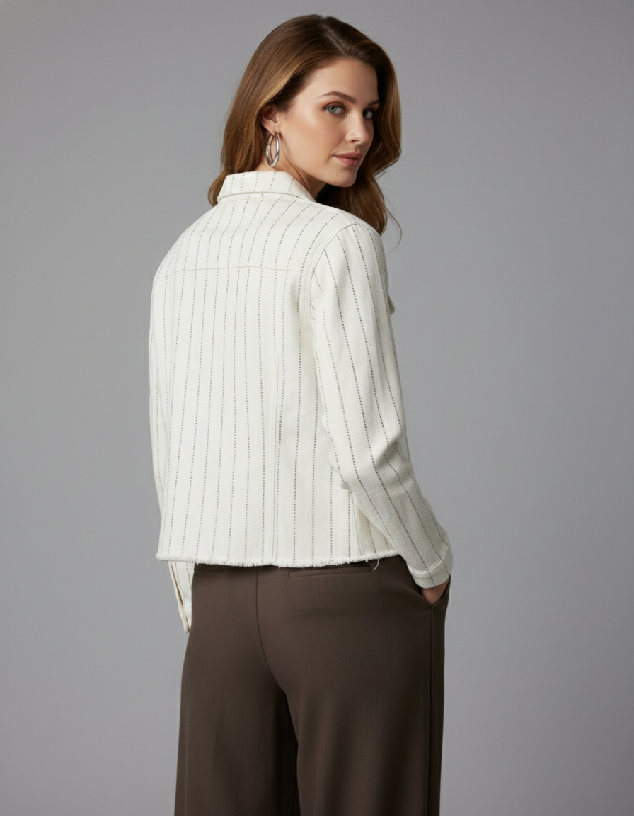 The vertical rows of small rhinestones running throughout the jacket, creates a subtle striped shimmer effect, and gives it a sleek, elongating look while still keeping the overall feel wearable and chic.