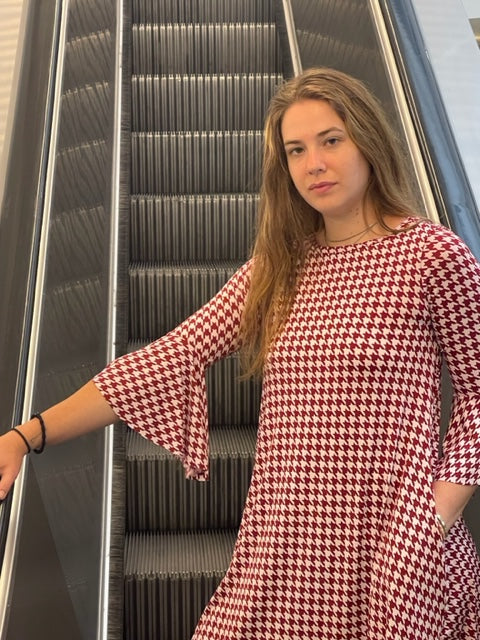 Style 83593-102 Burgundy White Bell Sleeve Game Day Tunic Dress W/side Pockets